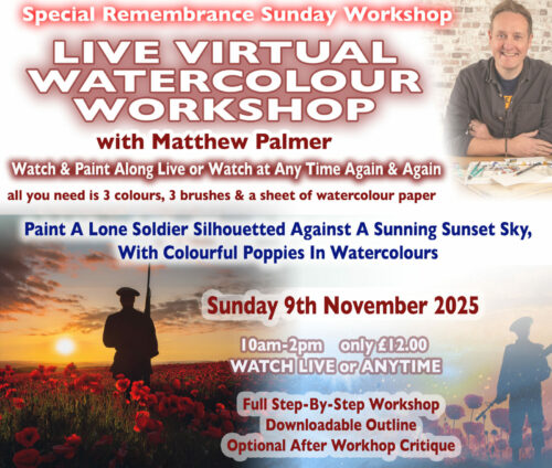 Live Virtual Watercolour Workshop With Matthew Palmer. Sunday 9th November 2025 – Special Remembrance Sunday Workshop £12.00 View Workshop