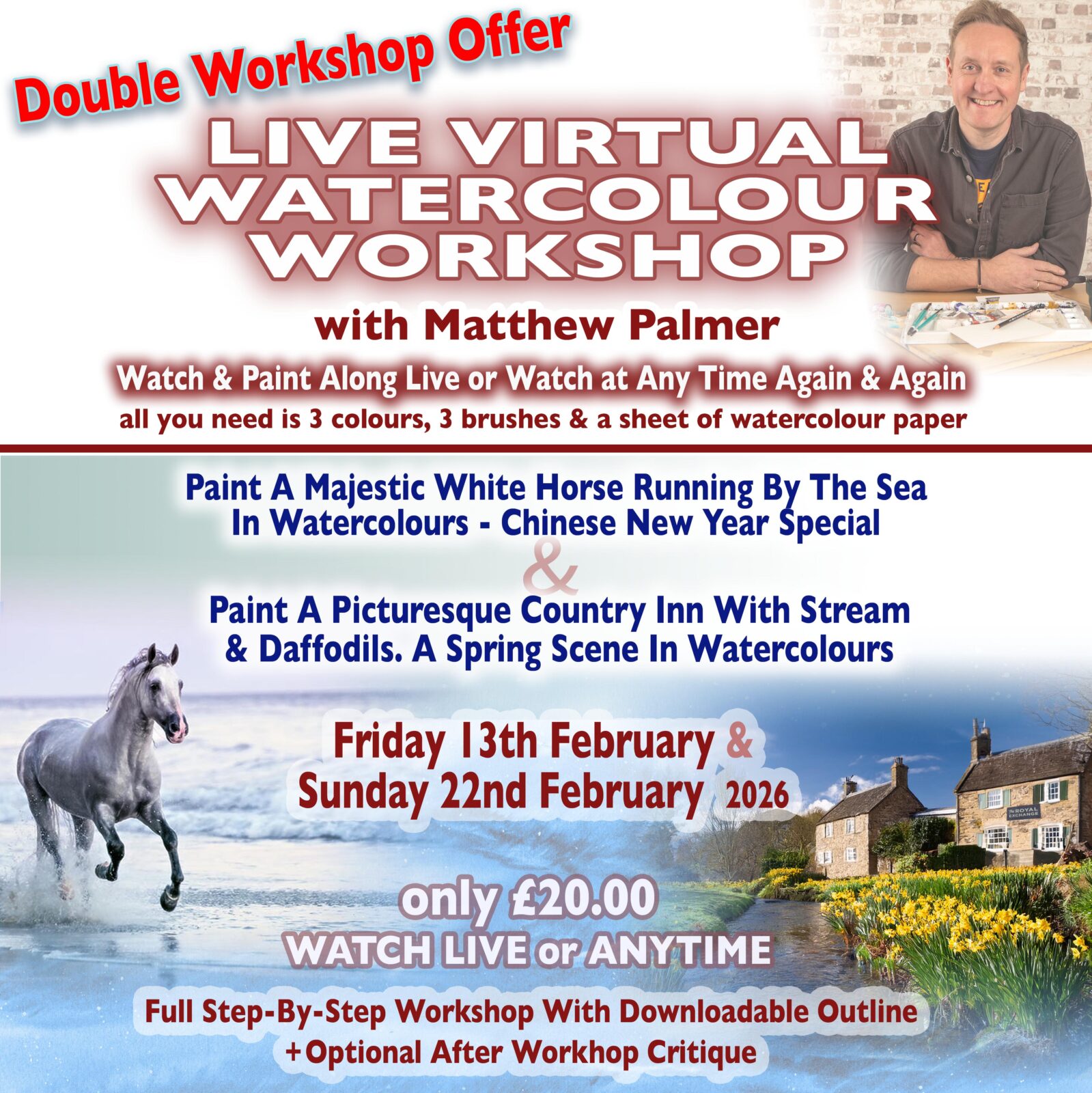 SPECIAL ONE-OFF DOUBLE WORKSHOP OFFER – Live Virtual Watercolour Workshop With Matthew Palmer. Friday 13th February & Sunday 22nd February 2026 (Save £4)