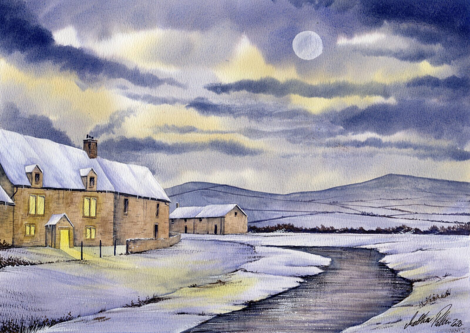 Paint ‘On A Moonlit Night’ A Stunning Snowy Village & Landscape In Watercolours
