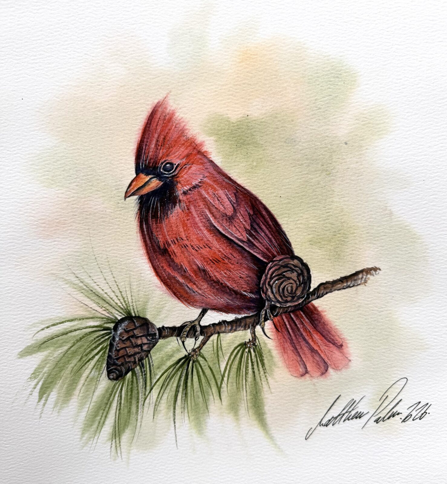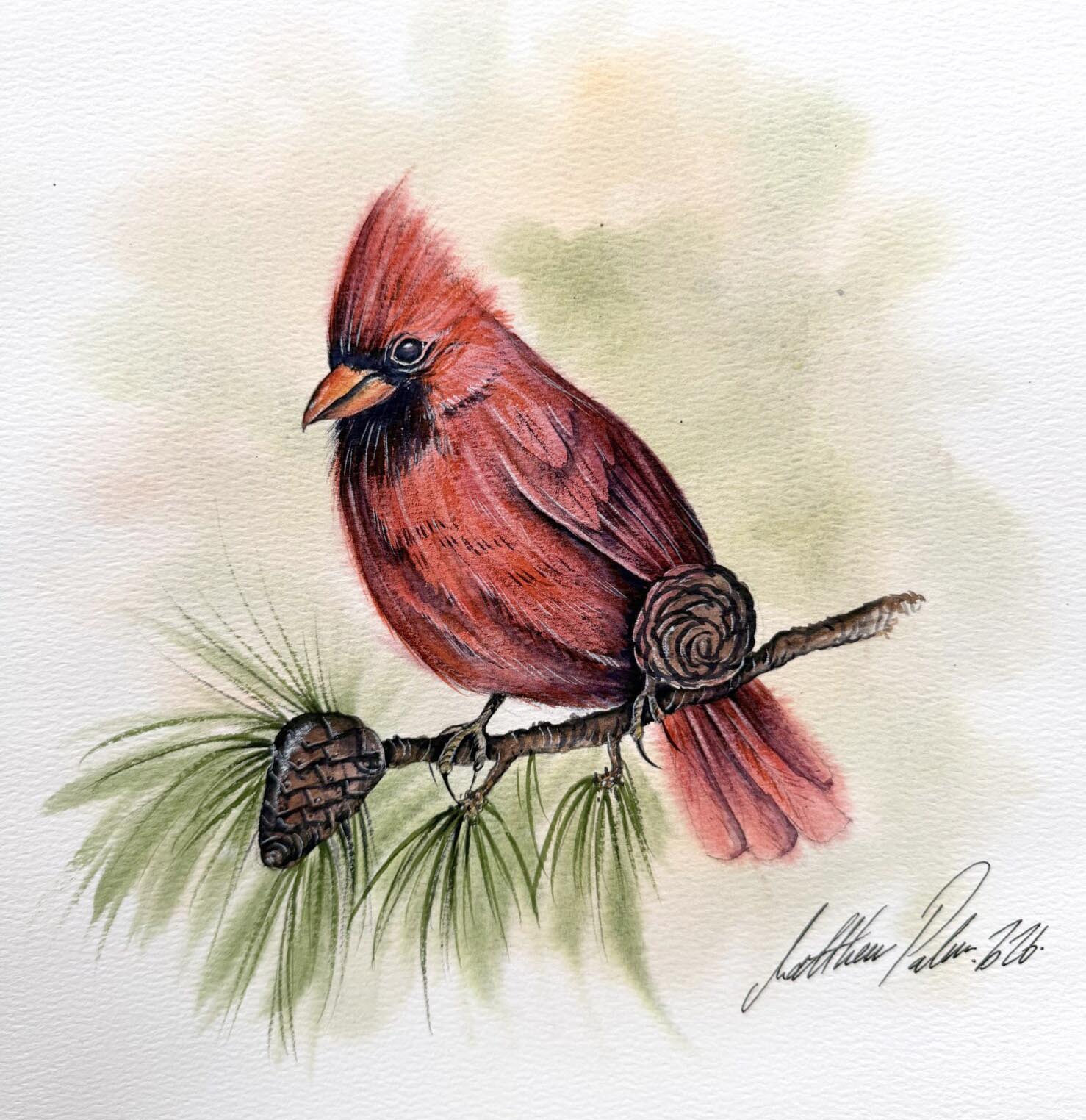 Paint A Colourful Cardinal Bird, Perched On A Pine Branch