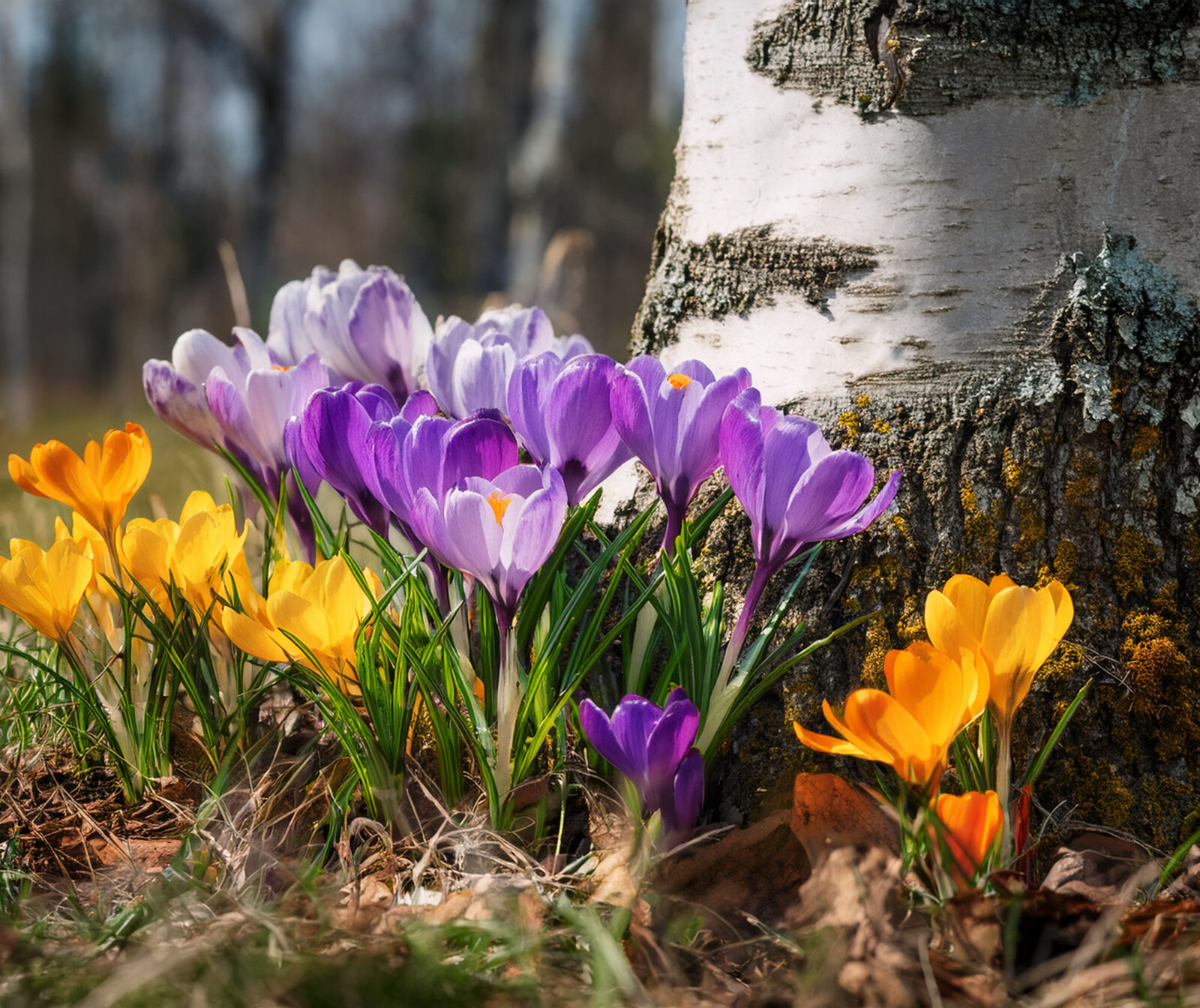 Paint Colourful Crocus Flowers By A Silverbirch Tree Trunk In Watercolours