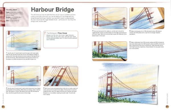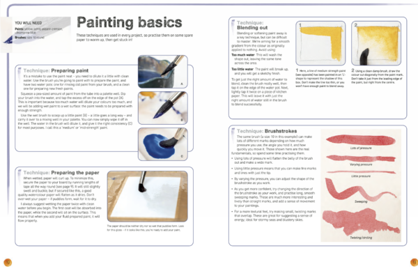 - Covers watercolour basics, building up from core watercolour techniques including preparing paper and paint and blending.